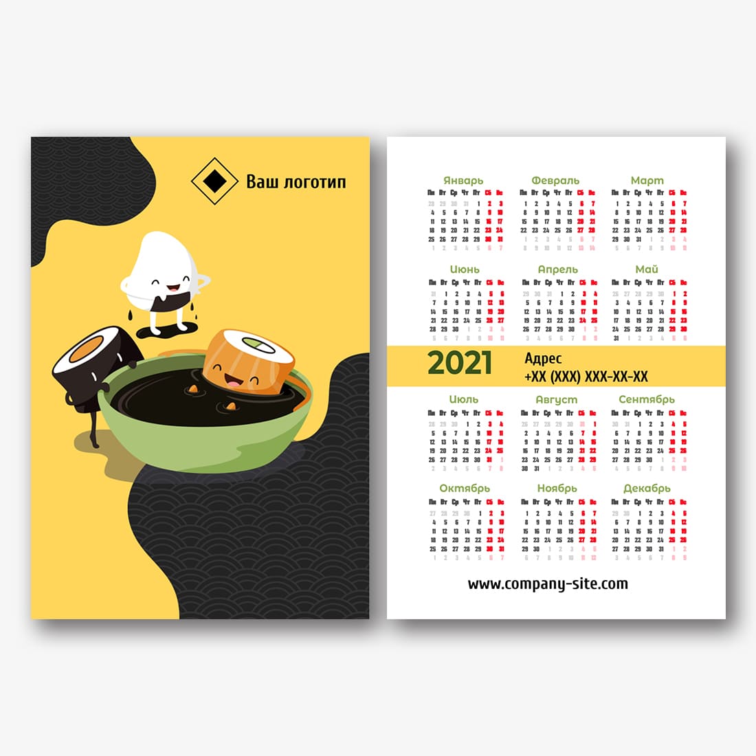 Бесплатный шаблон карманного рекламного календаря горизонтальный для рекламы ваших услуг. Создайте макет своими руками в конструкторе календарей.