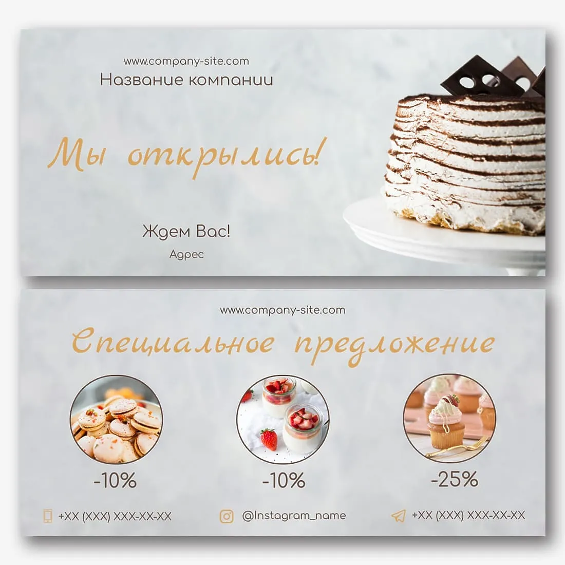 Бесплатный шаблон флаера для рекламы кондитера, кондитерской, магазина выпечки. Создайте макет флаера своими руками в онлайн-конструкторе флаеров.