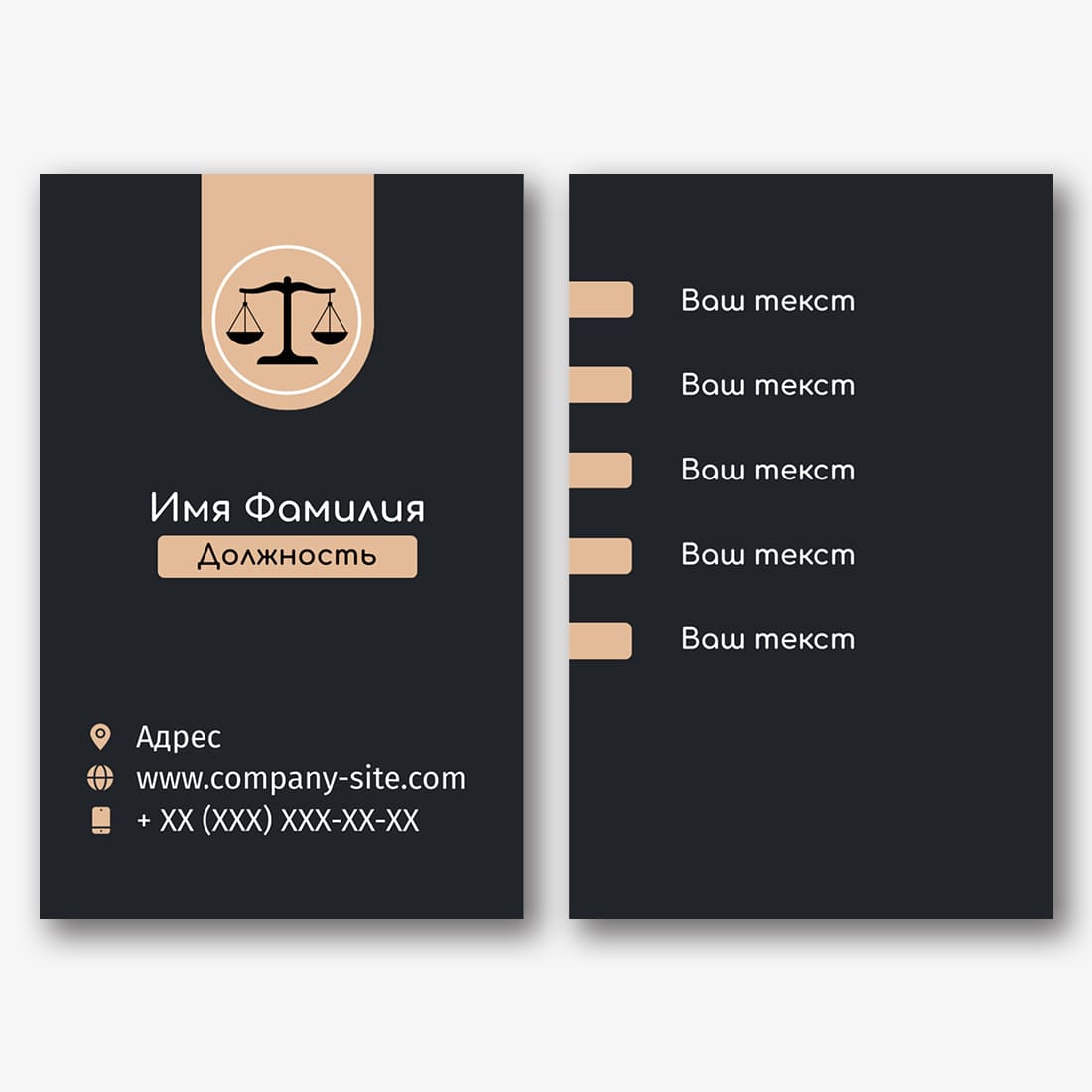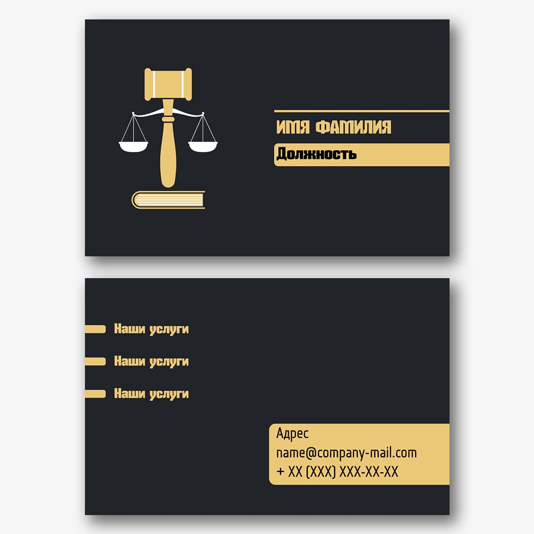 Бесплатный шаблон черной визитки для адвокатского бюро, юридической фирмы, адвоката, юриста. Создайте макет своими руками в конструкторе визиток.