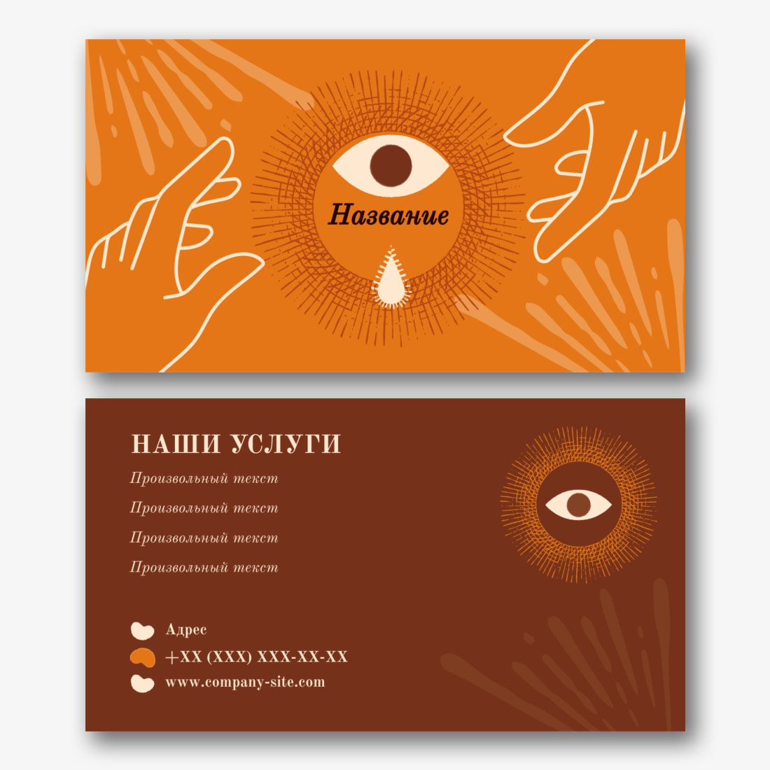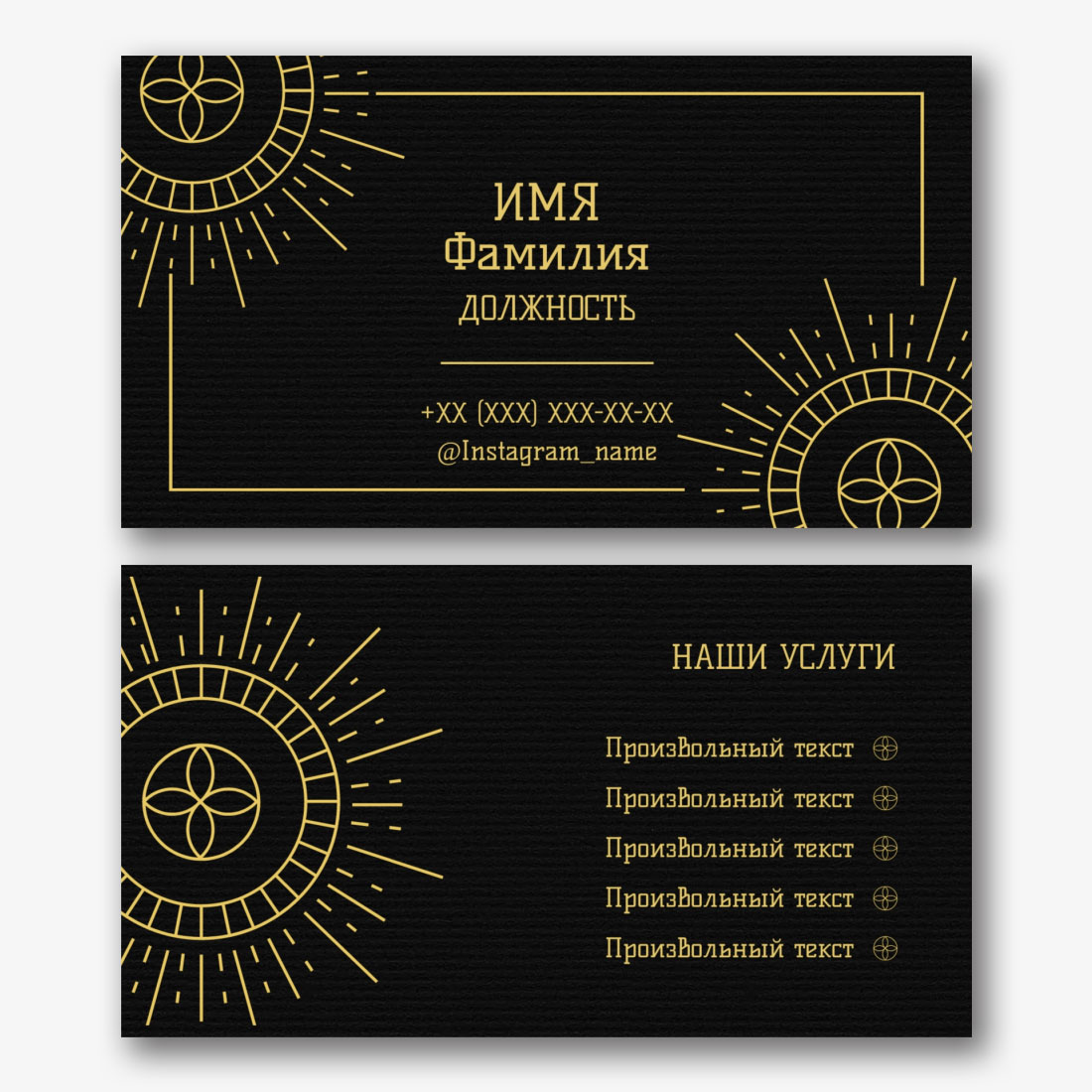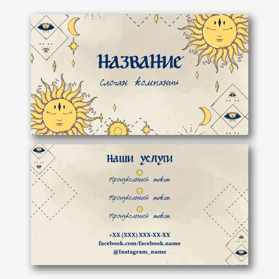 Этот тематический шаблон визитки создан специально для астрологов, тарологов, магов и экстрасенсов, которые стремятся подчеркнуть свою профессиональную деятельность и способности. Визитка содержит все необходимые элементы для создания уникального дизайна, который привлечет внимание вашей целевой аудитории. Загрузите свой логотип и добавьте контактные данные, такие как номер телефона, адрес электронной почты и веб-сайта, чтобы обеспечить легкую связь с вами. Используйте наш онлайн-конструктор, чтобы настроить визитку под свои потребности и поражать клиентов своими магическими навыками и уникальным видением. Не упустите возможность создать профессиональный и привлекательный образ с помощью этого шаблона визитки для астролога, таролога, мага или экстрасенса. Прикажите свою магию и ошеломляйте мир!
