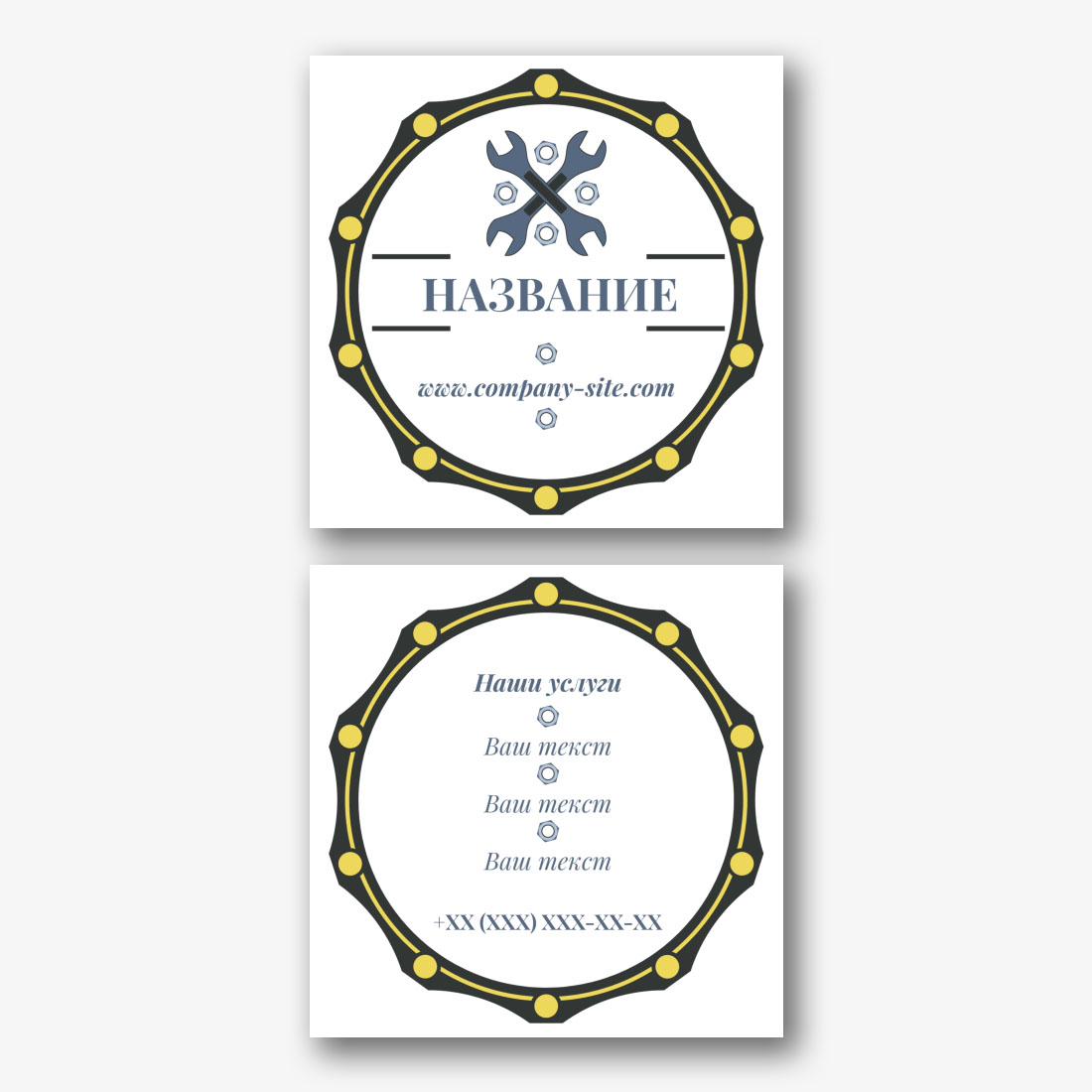 Готовый шаблон визитки в форме колеса для автосервиса или СТО, предлагающий широкие возможности кастомизации в онлайн-конструкторе. Создайте уникальную визитку, которая отражает стиль и индивидуальность вашего бизнеса.