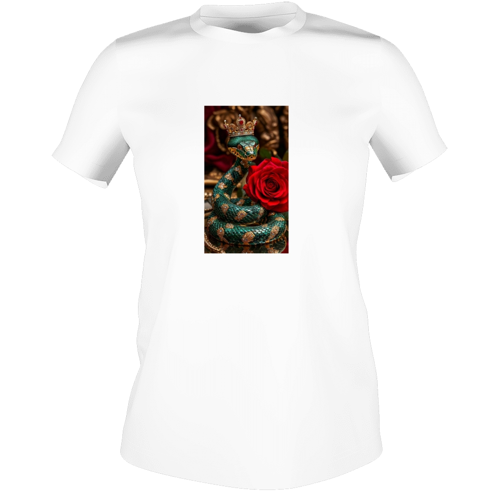 Футболка с принтом забавной змеи на дереве: большие губки с бантиком, веселая прическа, большие глаза и сказочный зеленый лес. Для детских и веселых образов.
