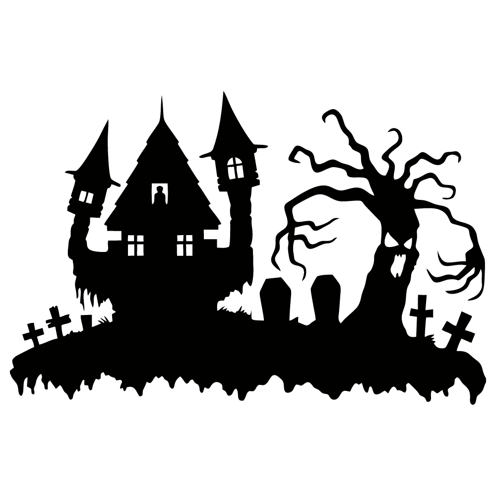 Обновленный дизайн Halloween-замка с филинами, летучими мышами, призраками и тематической бутафорией. Идеальная автонаклейка или декор на окно.