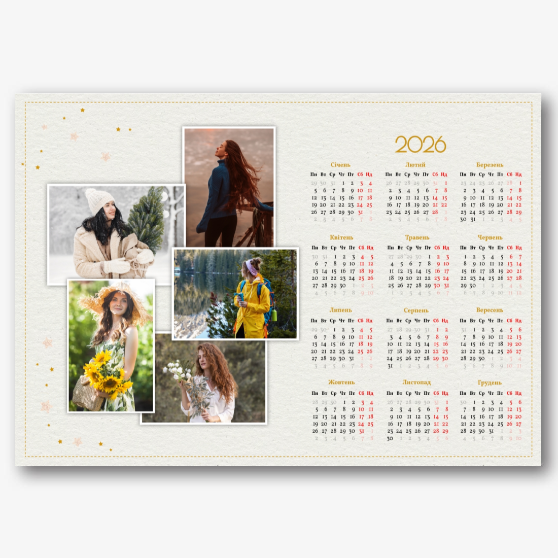 Безкоштовний шаблон сімейного календаря-плакату онлайн з пам'ятними моментами. Створіть макет своїми руками в онлайн-конструкторі календарів.