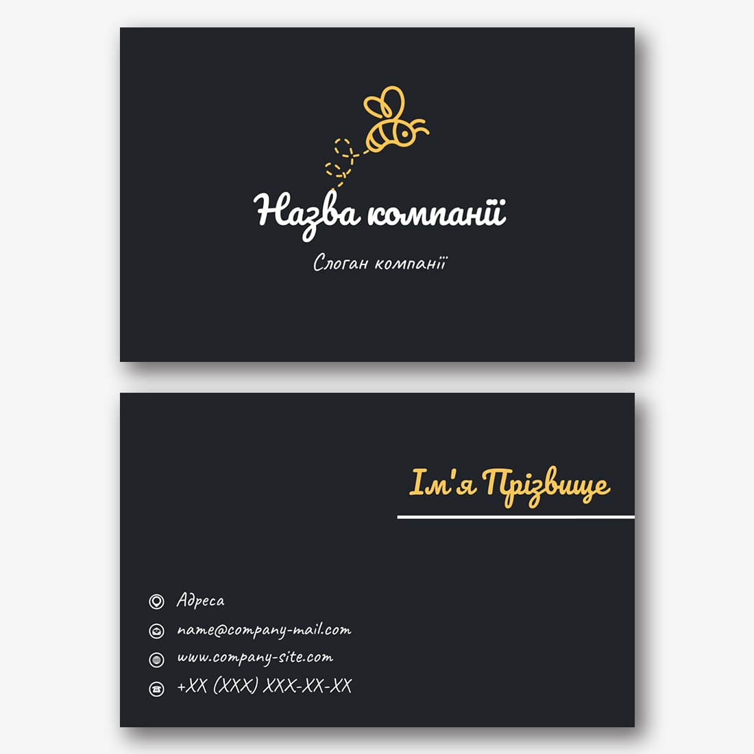 Безкоштовний шаблон чорної візитки пасічника, продавця меду, постачальника меду, пасіки. Створіть макет своїми руками в конструкторі візиток.