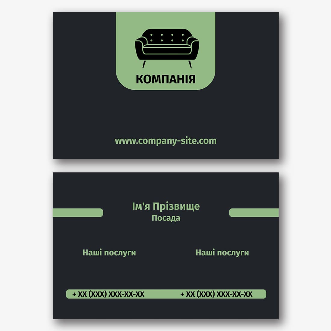 Безкоштовний шаблон чорної візитки для меблевого салону, фурнітурщіка, фабрики меблів. Створіть макет своїми руками в конструкторі візиток.