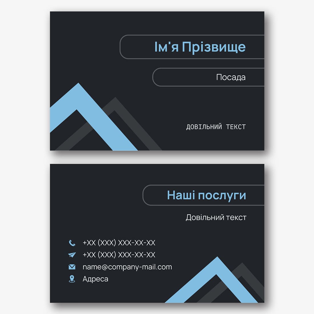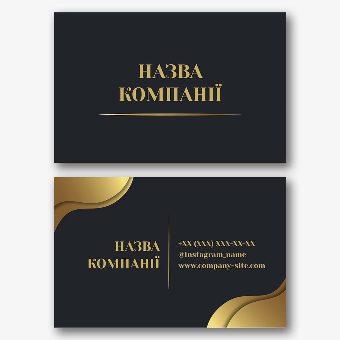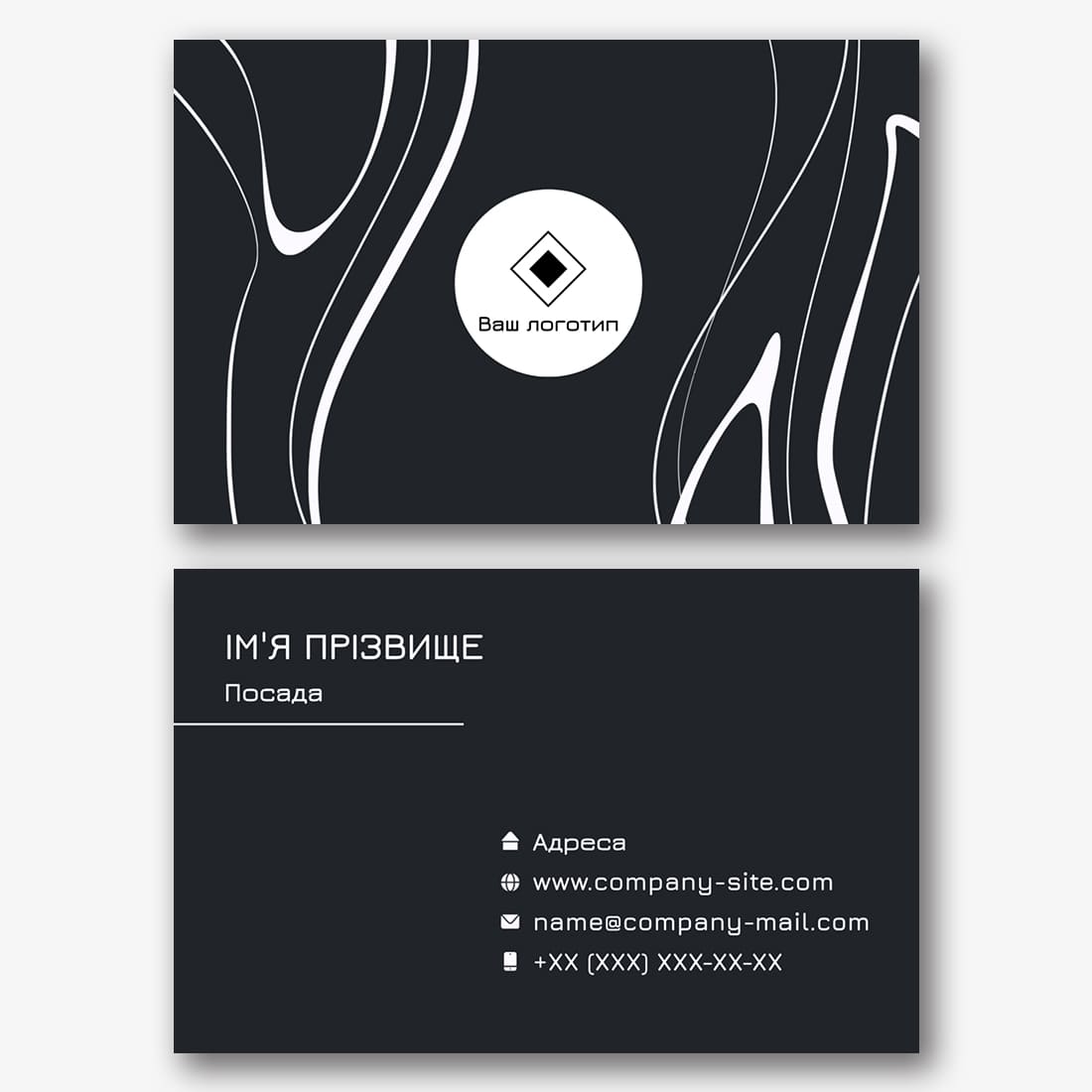 Безкоштовний шаблон абстрактної, корпоративної, стильної, чорної візитки. Створіть макет своїми руками в конструкторі візиток.