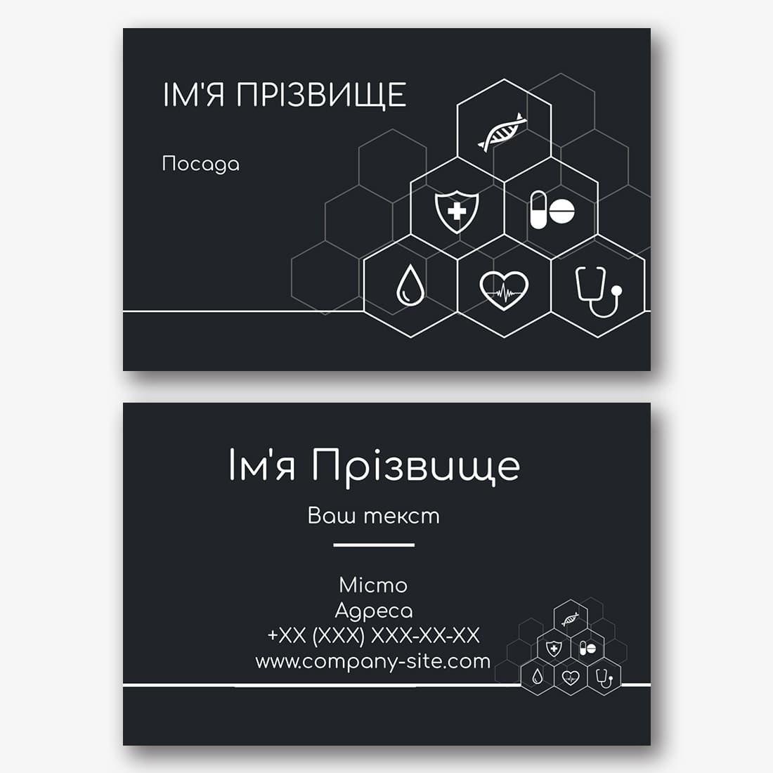Безкоштовний шаблон чорної візитки для кардіолога, медпрацівника, лікаря, фельдшера. Створіть макет візитки своїми руками в конструкторі візиток.