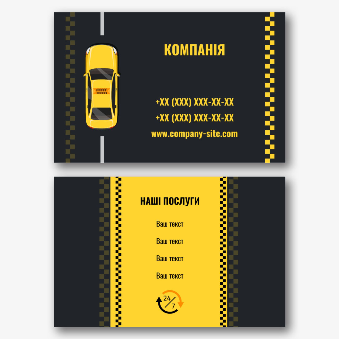 Безкоштовний шаблон чорної візитки для служби таксі, таксиста. Створіть макет своїми руками в конструкторі візиток.