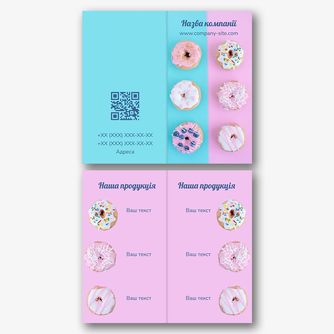 Безкоштовний шаблон подвійної візитки для кондитерської, кондитера, магазину випічки, пекаря. Створіть макет своїми руками в конструкторі візиток.