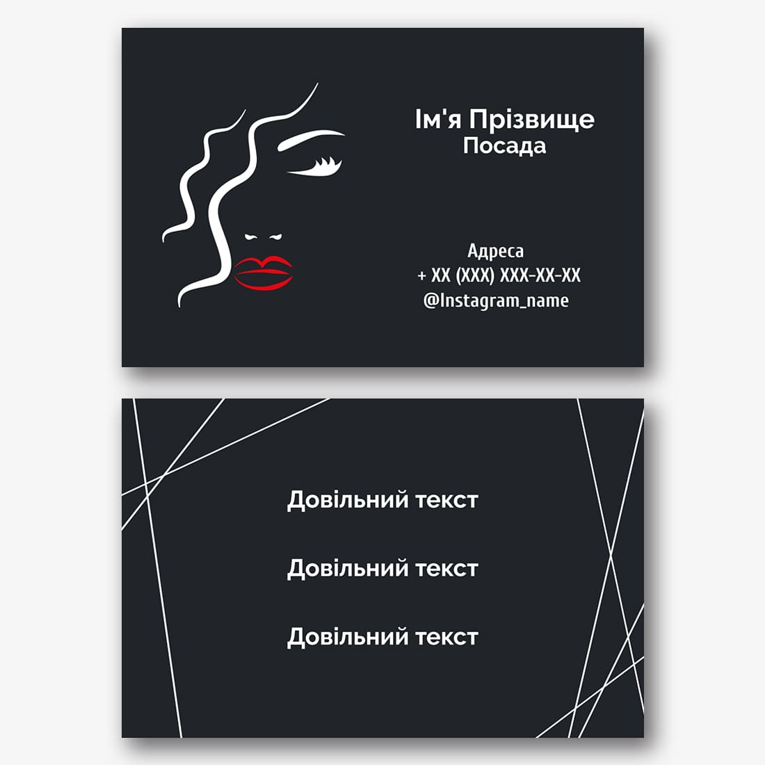 Безкоштовний шаблон чорної візитки для салону краси, студії краси, співробітників салону краси. Створіть макет своїми руками в конструкторі візиток.