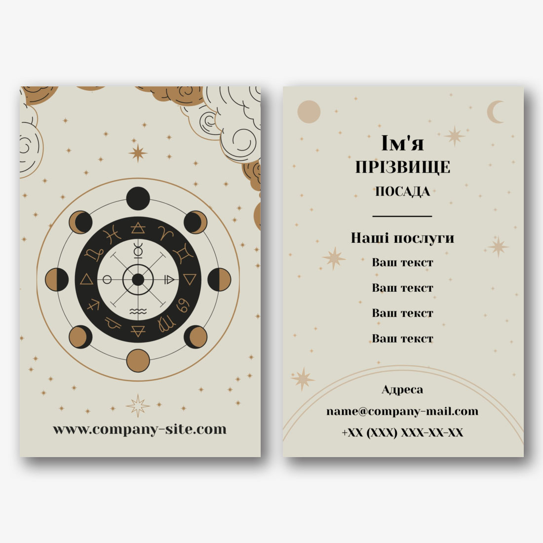 Цей шаблон євровізитки астролога, таролога, мага, екстрасенса оформлений з тематичним оформленням, спеціально для представників цих професій. Він містить всі необхідні елементи, щоб допомогти вам створити унікальну візитну картку, що відображає ваші магічні навички та унікальне бачення. Ви можете скористатися цим шаблоном в нашому онлайн-конструкторі, додати свій логотип, вказати контактні дані, такі як номер телефону, адресу електронної пошти та адресу веб-сайту, якщо є. Таким чином, ваша візитка буде готова привертати увагу вашої цільової аудиторії і відображати вашу професійну діяльність.