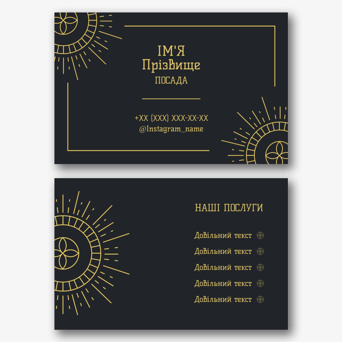 Представники професій астролога, таролога, мага та екстрасенса можуть знайти ідеальне рішення для своєї візитної картки у шаблоні "Євровізитка астролога, таролога, мага, екстрасенса". Цей шаблон пропонує все необхідне для створення унікальної візитки, яка відображатиме вашу професійну діяльність та зацікавить вашу цільову аудиторію. Використовуйте наш онлайн-конструктор, щоб додати свій особливий стиль, вибрати кольорову схему та розмістити символіку, яка вас найкраще представляє. Додайте свій логотип та контактні дані, такі як номер телефону, адреса електронної пошти та веб-сайту, щоб забезпечити вашу аудиторію необхідною інформацією. Завдяки нашому шаблону "Євровізитка астролога, таролога, мага, екстрасенса" ви зможете виділитися серед конкуренції та показати вашу унікальність та професіоналізм. Не витрачайте багато часу і зусиль - створіть привабливу візитку з легкістю!