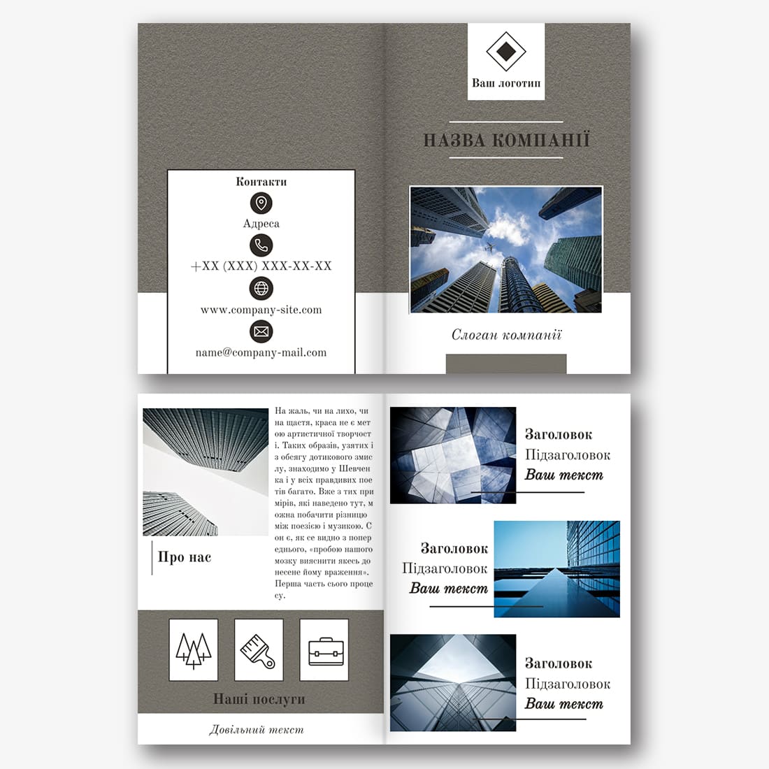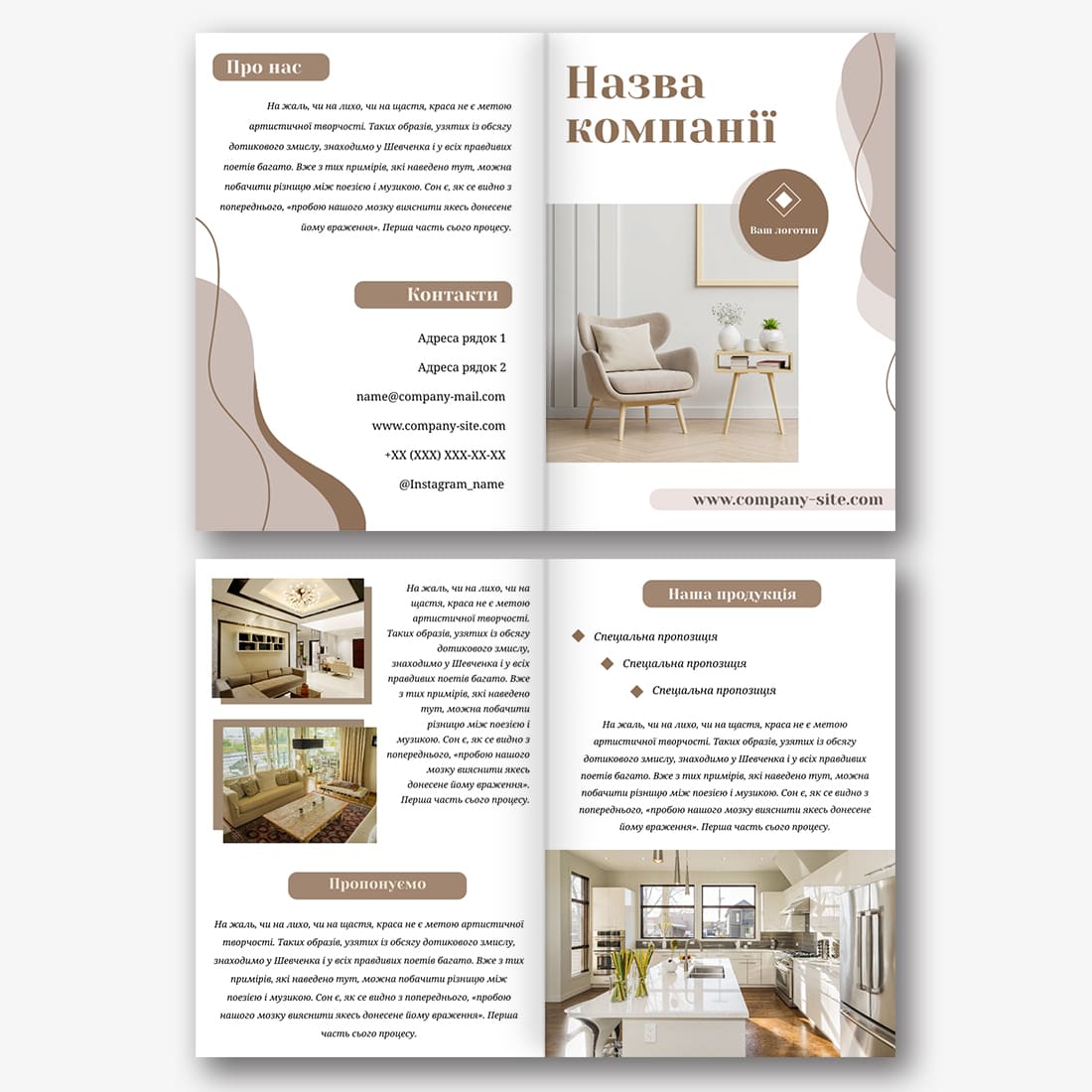 Безкоштовний шаблон іміджевого буклета онлайн студії дизайну інтер'єру, компанії з дизайну. Створіть макет власноруч в онлайн-конструкторі буклетів.