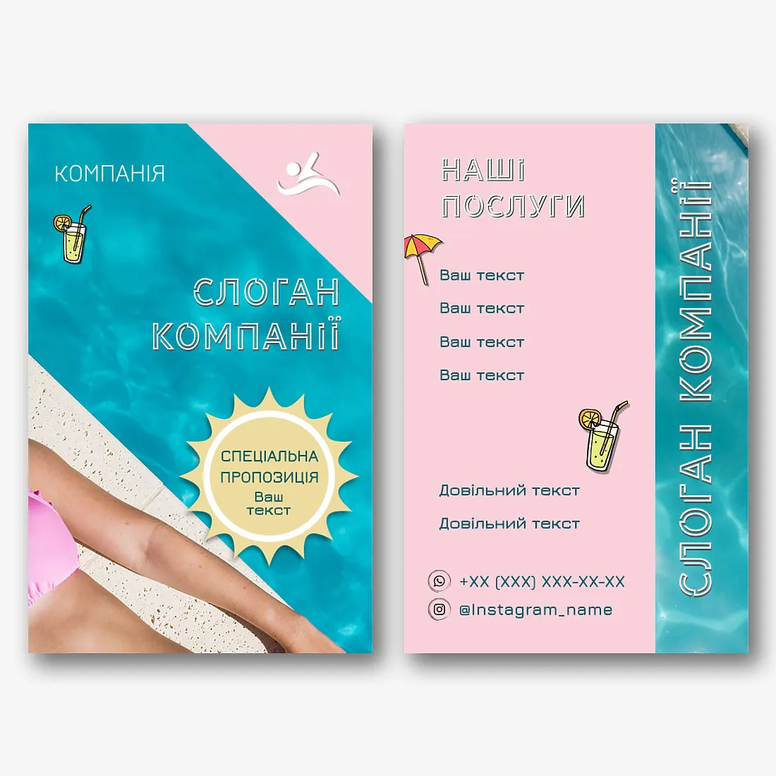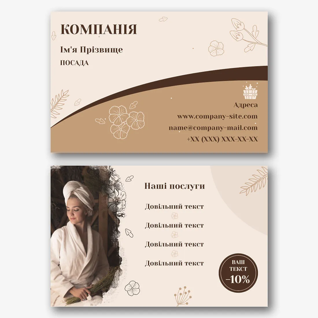 Шаблон євровізитки для лазень і саун — це поєднання елегантності та практичності. Він відображає атмосферу вашого закладу за допомогою вишуканого дизайну та вишуканих шрифтів. Використовуйте його, щоб виділитися серед конкурентів та привернути увагу клієнтів.