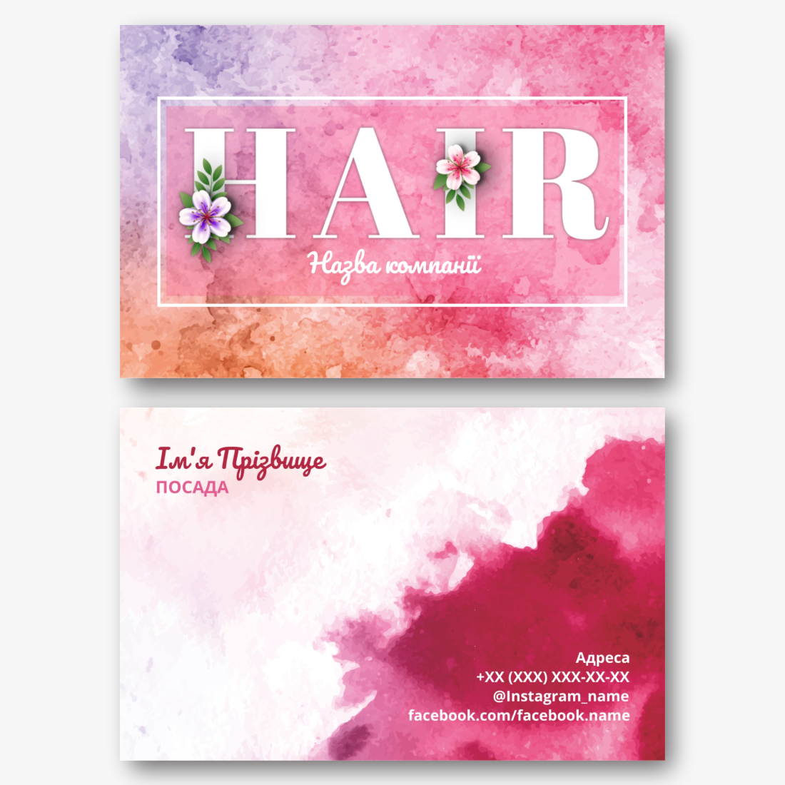 Безкоштовний шаблон візитки для перукаря. Легке редагування в онлайн-конструкторі для створення унікального дизайну. Ідеально підходить для стилістів, візажистів та інших фахівців у сфері краси.