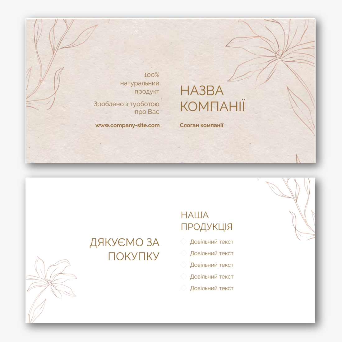 Безкоштовний шаблон універсальної квадратної бирки-книжки. Підходить для магазинів одягу, ювелірів, флористів та виробників. Легке редагування тексту, кольорів, додавання логотипів і QR-кодів в онлайн-конструкторі.