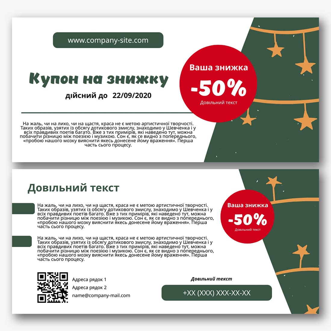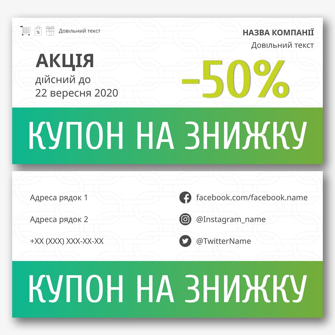 Безкоштовний шаблон купона на знижку. Створюйте макети своїми руками в онлайн-конструкторі купонів на знижку.