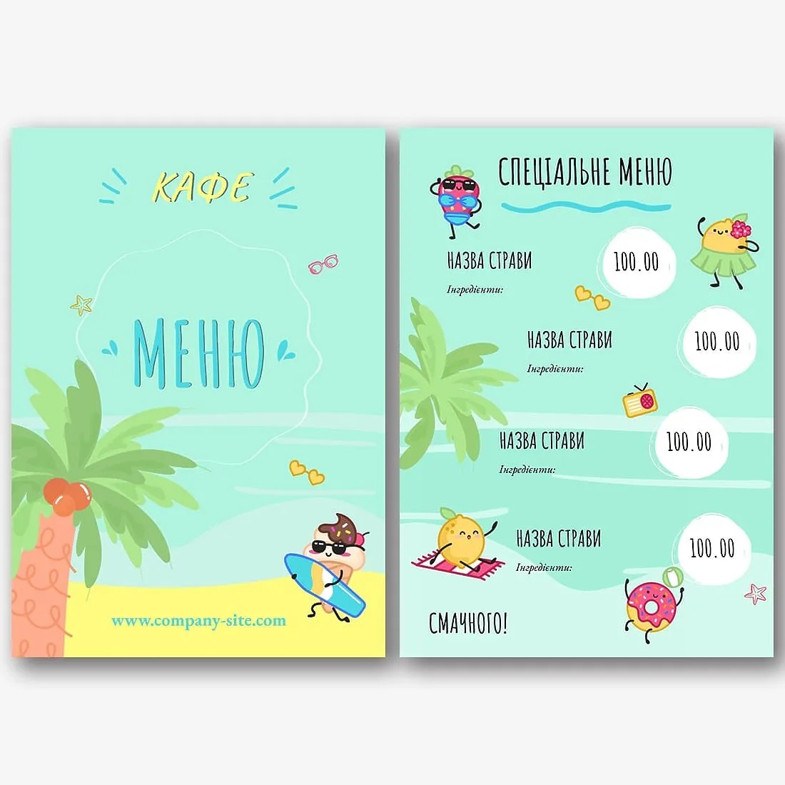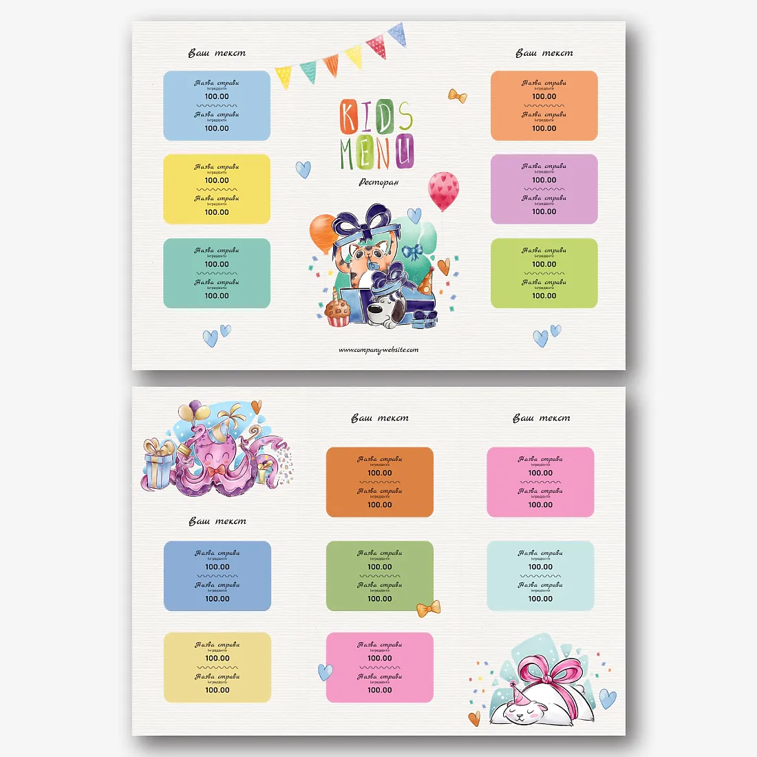 Яскравий шаблон дитячого меню на аркуші для кафе та ресторанів, який легко адаптується в онлайн-конструкторі під стиль вашого закладу.