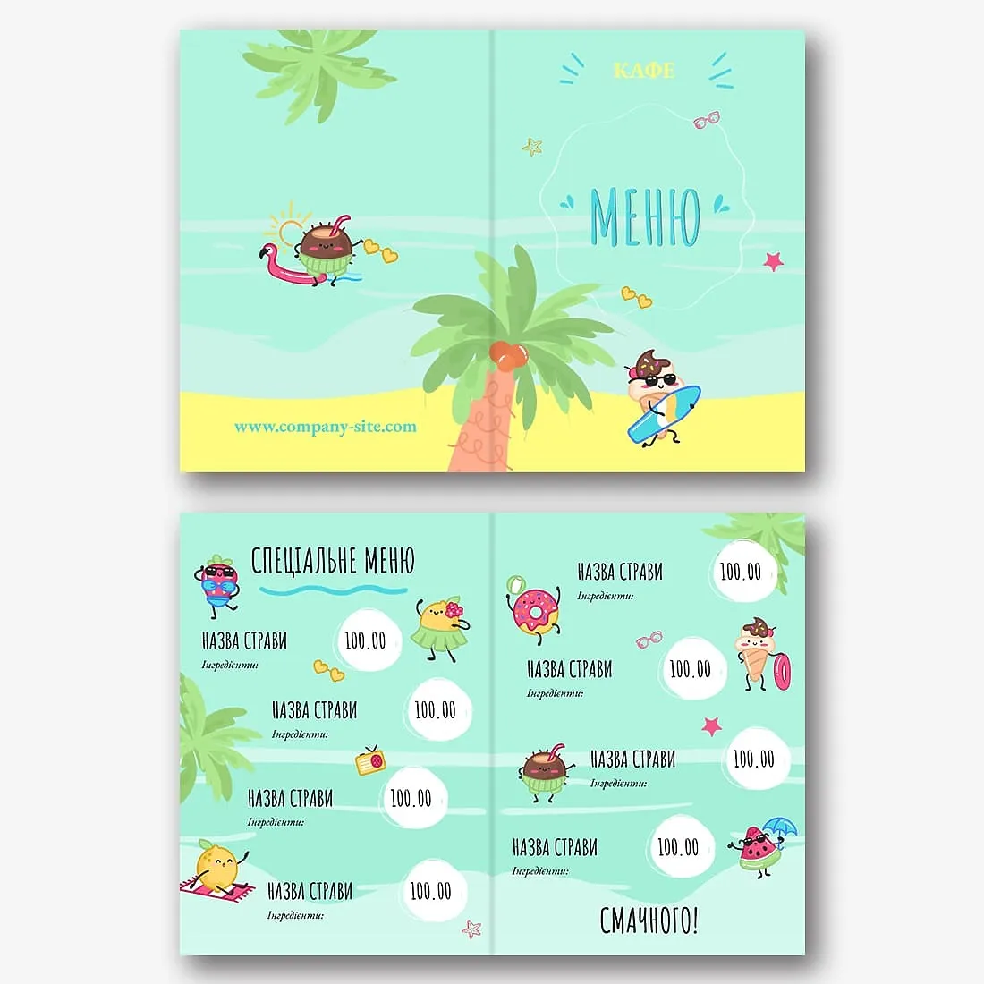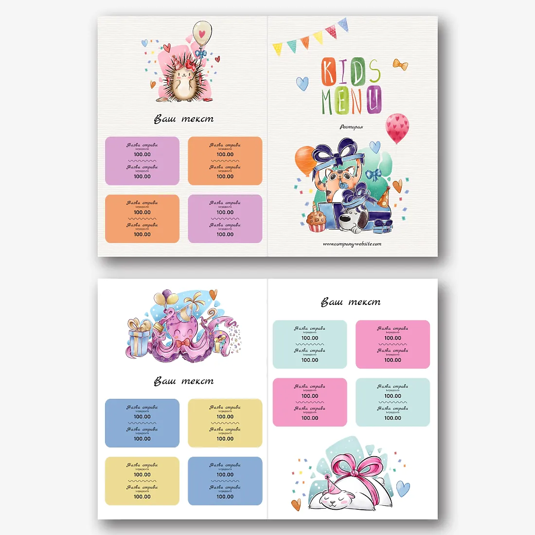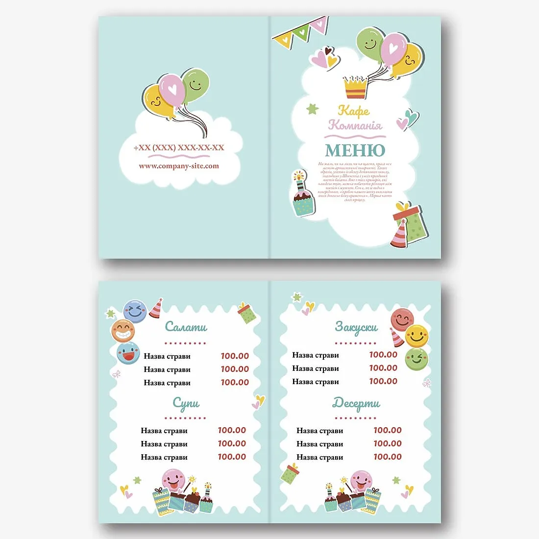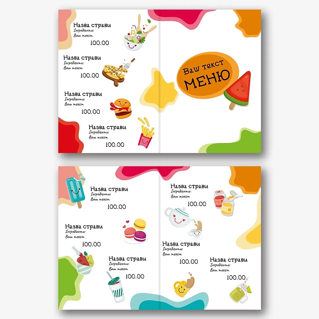 Готовий яскравий шаблон дитячого меню-буклету з простим онлайн-редагуванням під стиль вашого кафе або ресторану.