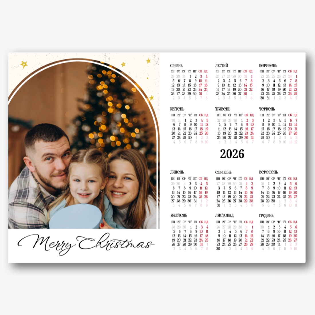 Теплий настінний календар «Наша сім’я» з можливістю додати власні весільні чи сімейні фото. Редагуйте підписи, кольори та шрифти в онлайн-конструкторі. Підійде як особистий декор і стильний подарунок для рідних.