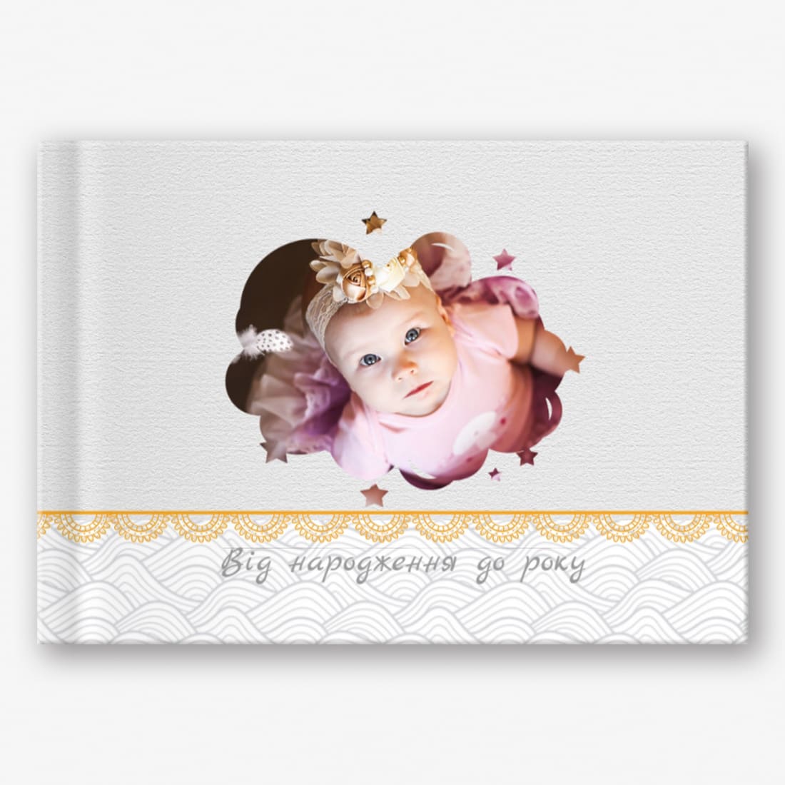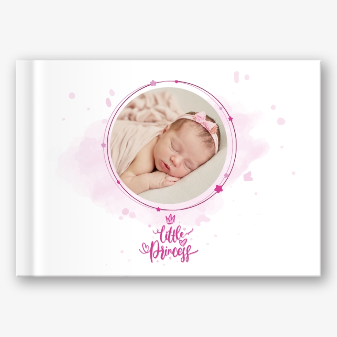 Безкоштовний шаблон дитячої фотокниги новонародженої дівчинки. Створіть макет власноруч в онлайн-конструкторі фотокниг.