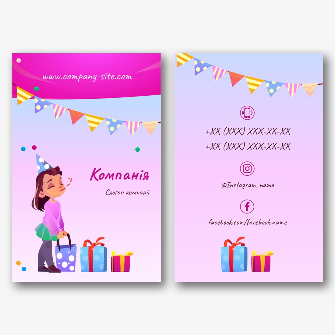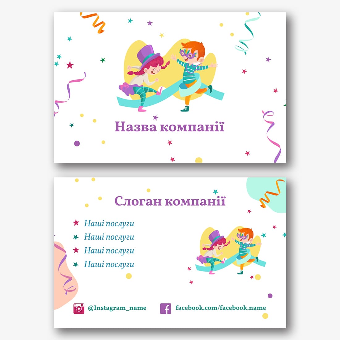 Безкоштовний шаблон візитки організатора вечірок, оформлення вечірок, аніматора вечірок. Створіть макет своїми руками в конструкторі візиток.