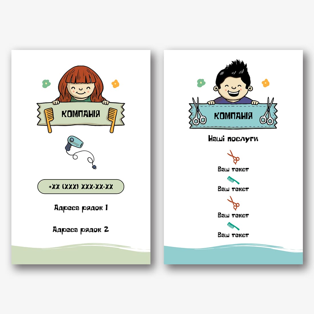 Безкоштовний шаблон візитки стиліста-перукаря, салонів краси, майстра з нарощування волосся. Створіть макет своїми руками в конструкторі візиток.